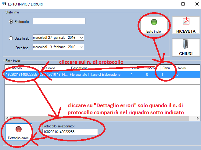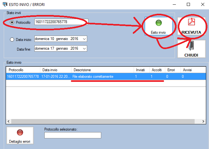 verificare l'esito dell'invio (documenti inviati, accolti, errori, avvisi) e poi cliccare su RICEVUTA per scaricare