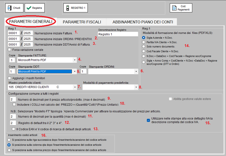 14. Selezionare la modalità di assegnazione del nome dei files PDF/XLS creati dal modulo fatturazione