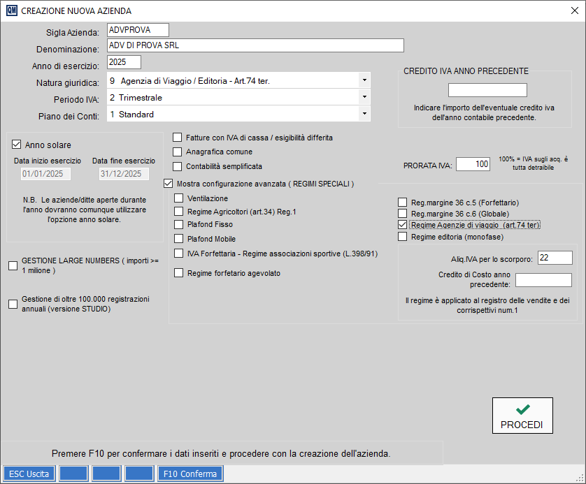 Considerate le peculiarità di tale regime fiscale è necessario creare un'azienda contabile con natura giuridica “9 Agenzia di Viaggio – Art. 74 ter.” ed impostare il flag