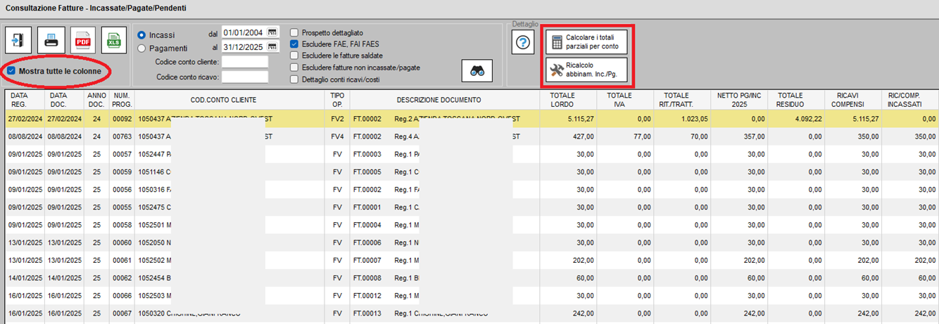Di conseguenza, lo stato di ciascuna fattura (pagata, incassata o pendente) è determinato in base agli importi effettivamente pagati o incassati, elaborati con le causali INC e PG