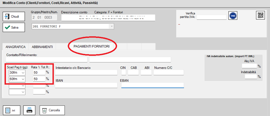 Esempio: da contratto di fornitura, il fornitore ha applicato una modalità di pagamento in due rate a 30/60 gg fine mese.
