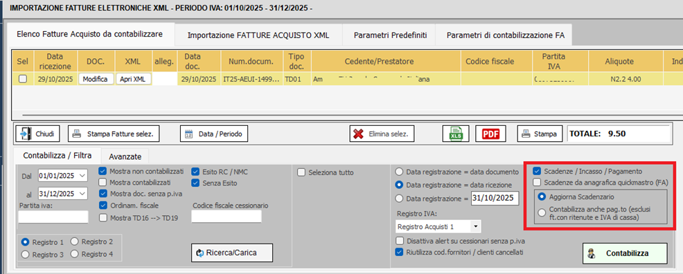 In particolare, il sistema rileva la data di scadenza riportata nel file XML (campo relativo ai termini di pagamento) e la imposta come data di scadenza per la registrazione che viene creata nello scadenzario.