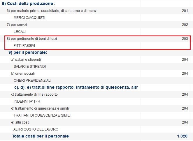 es. il conto "Fitti passivi" o "affitto" dovrà risultare abbinato in dare nella voce "B) Costi della produzione -->8) per godimento di beni di terzi".