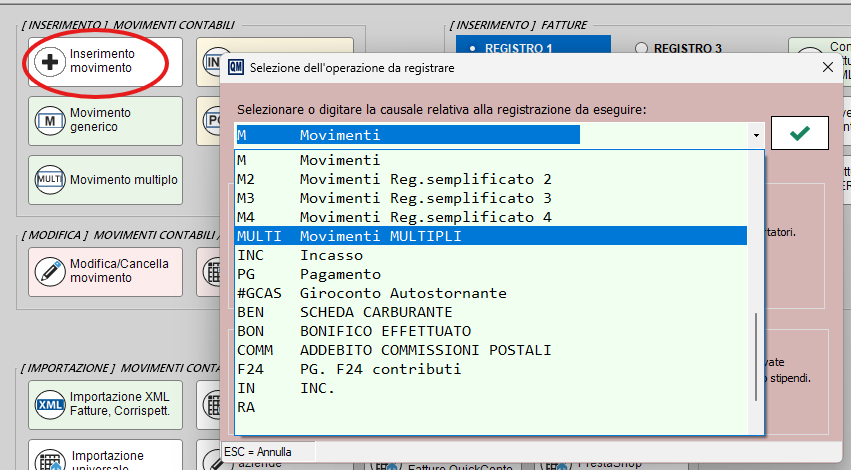 1. Accedere a "Inserimento movimento" --> selezionare la registrazione MULTI Movimenti Multipli