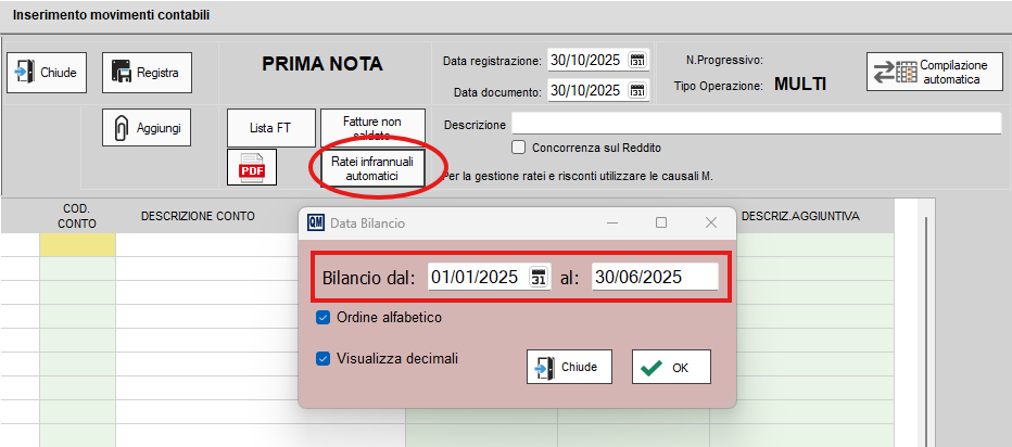 2. Lanciare la funzione "Ratei infrannuali automatici" per generare i ratei automatici relativi al periodo indicato