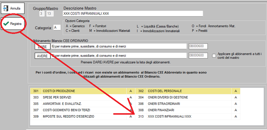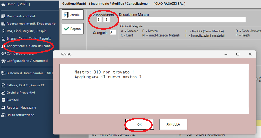 Dal menù "Anagrafiche e Piano dei Conti" ---> Gestione Mastri creare un nuovo MASTRO (es. 3 13)