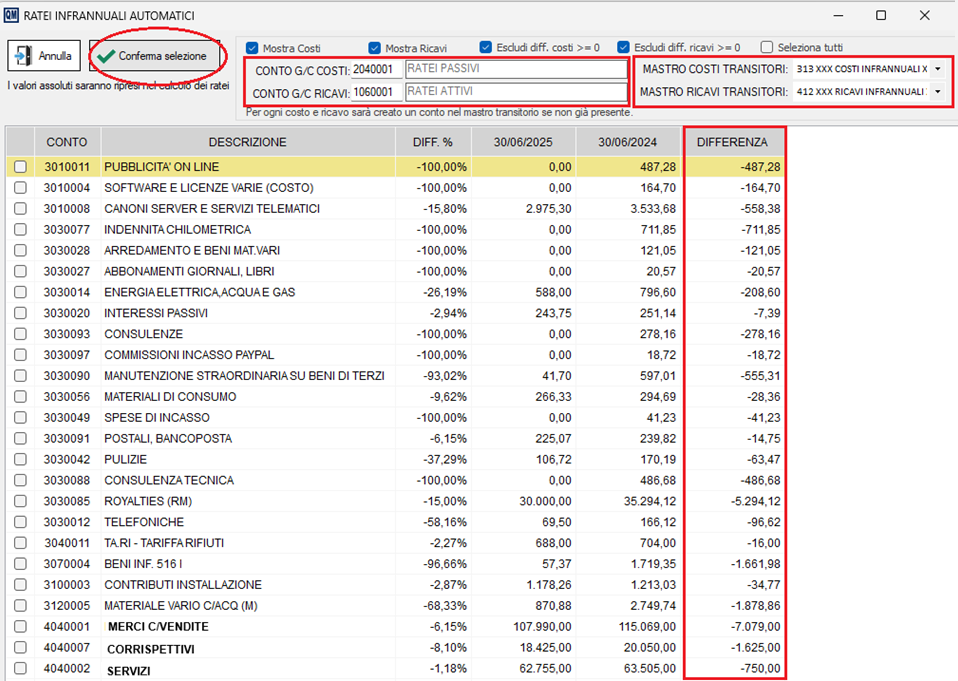 Selezionando le voci di costo e di ricavo da accertare, tale differenza sarà riportata nel bilancio infrannuale in modo automatico.