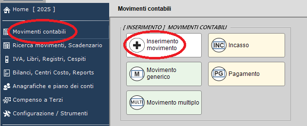 Accedere al menù "Movimenti contabili" --> Inserimento movimento