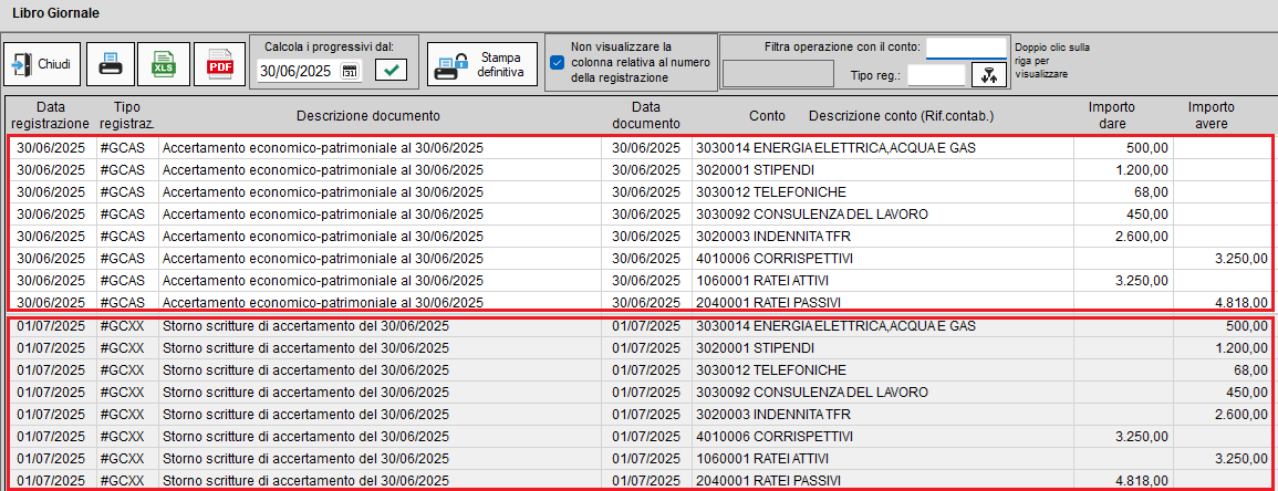 Le scritture di accertamento che generalmente portano la data di fine esercizio, ovvero il 31 dicembre, in questo caso vengono registrate alla data della stesura del bilancio infrannuale (es. 30/06)