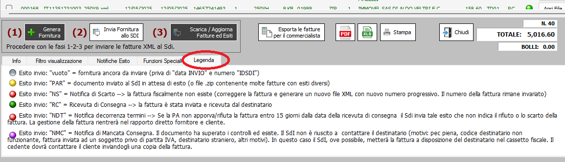 Lo stato dell'invio delle fatture viene visualizzato nella colonna "Esito" e viene raffigurato con un segnale di semaforo di colore diverso come illustra la legenda