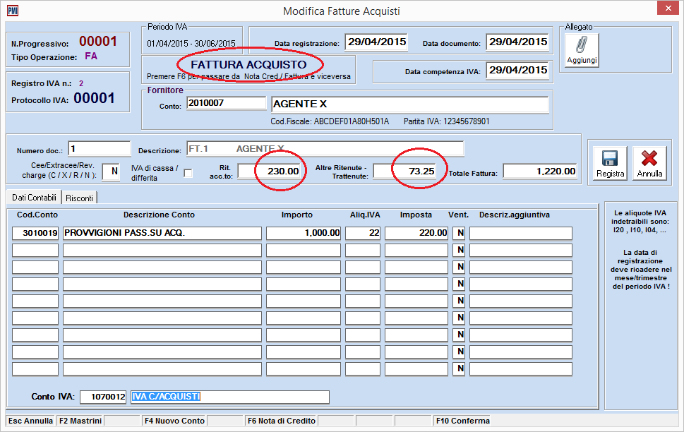Nell'esempio sotto riportato è stata registrata una fattura per provvigioni di euro 1.000+IVA (ritenuta di acconto es. euro 230 es. 23% e ritenuta Enasarco 73.25 es. aliquota al 14.65% da applicare sul 50% dell'imponibile)