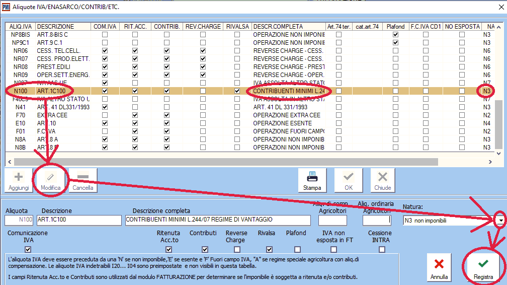Selezionare l'aliquota IVA, cliccare su MODIFICA e selezionare la “Natura aliquota” tra quelle indicate nell'elenco: N1,N2,N3,N4,N5, N6,N7.
