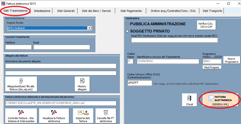- cliccare sul bottone “FATTURA ELETTRONICA (GENERA XML)” presente nella scheda "Dati trasmissione".