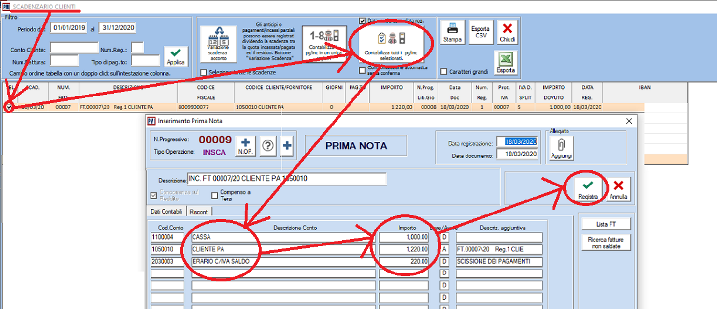 FIGURA 2: incasso della fattura tramite la funzione "Scadenzario Clienti" --> bottone "Contabilizza tutti i pg/inc selezionati"