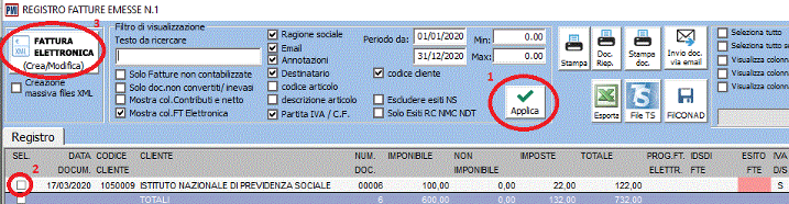 Aprire il registro delle vendite (es. registro delle vendite n. 2) cliccando sul bottone “Reg. FT XML” e cliccare sul bottone “applica” per visualizzare l'elenco delle fatture emesse.