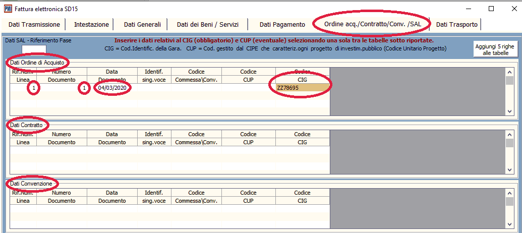 6. ORDINE ACQ./CONTRATTO/CONV./SAL: la compilazione di questa scheda è obbligatoria in quanto si deve necessariamente indicare il CIG e l'eventuale CUP;