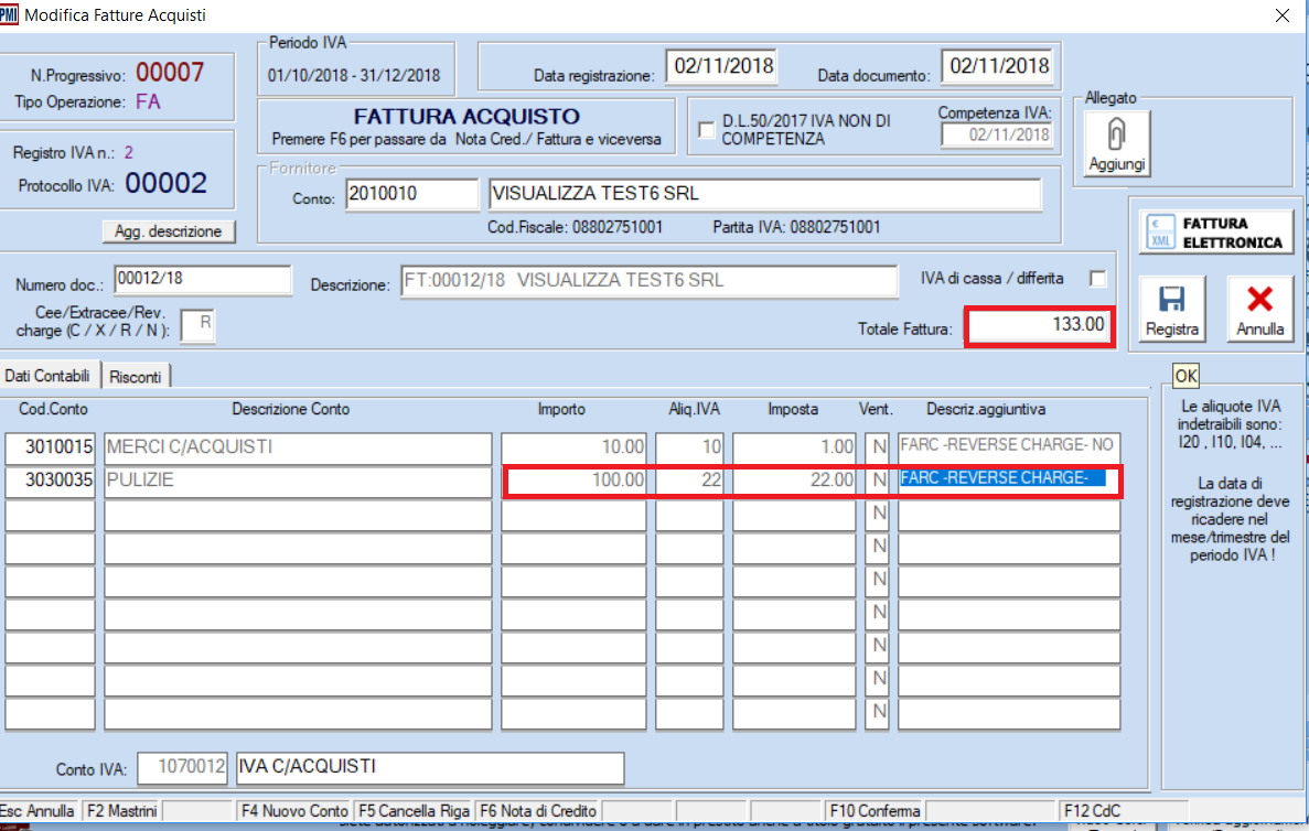 Il sistema eseguirà la registrazione della fattura e l'inversione contabile (in questo esempio una inversione contabile parziale in quanto non tutta la fattura era soggetta a reverse charge, ma solo la seconda riga).