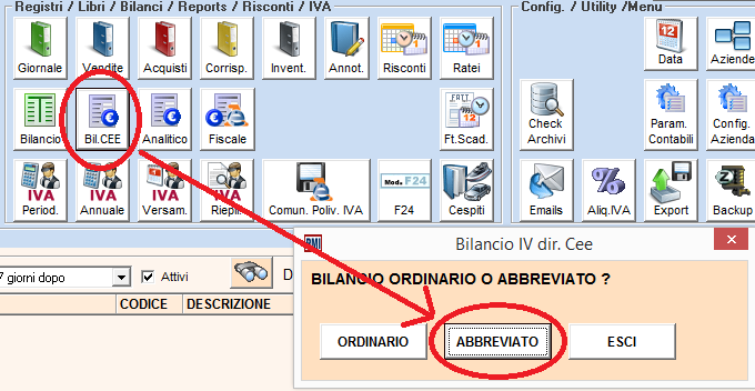 Elaborare il bilancio CEE ordinario o abbreviato con il bottone "Bil. CEE" .