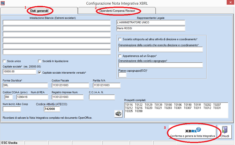 Compilare i dati richiesti nella scheda 1 (dati generali) e nella scheda 2 (Dipendenti/Compensi/Revisori) e procedere