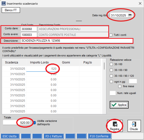 Ogni scadenza può essere definita indicando la data di scadenza, la descrizione, l’importo (se previsto), la categoria e eventuali note o riferimenti utili.