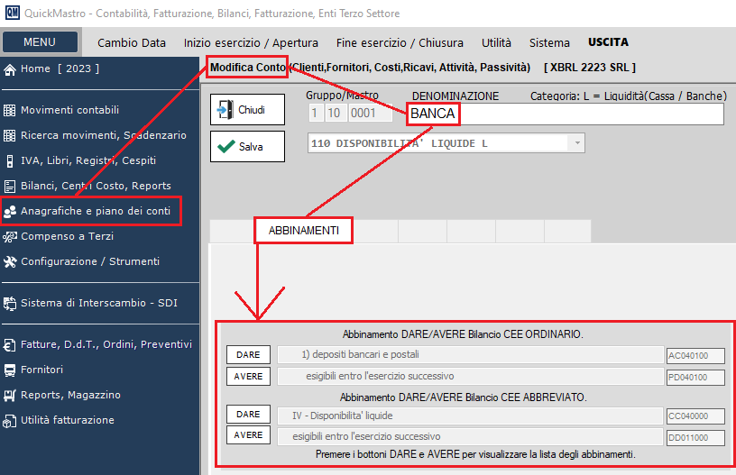 L'abbinamento deve essere indicato e verificato sia per il saldo DARE che per il saldo AVERE. Infatti il saldo del conto "banca" in genere funziona in DARE e quindi nel bilancio CEE deve essere abbinato alle disponibilità liquide, ma se per qualche motivo dovesse chiudersi con un saldo avere es. perchè trattasi di un fido o un prestito allora l'abbinamento sarà necessariamente in un conto del passivo es. debiti verso istituti bancari entro 12 mesi.