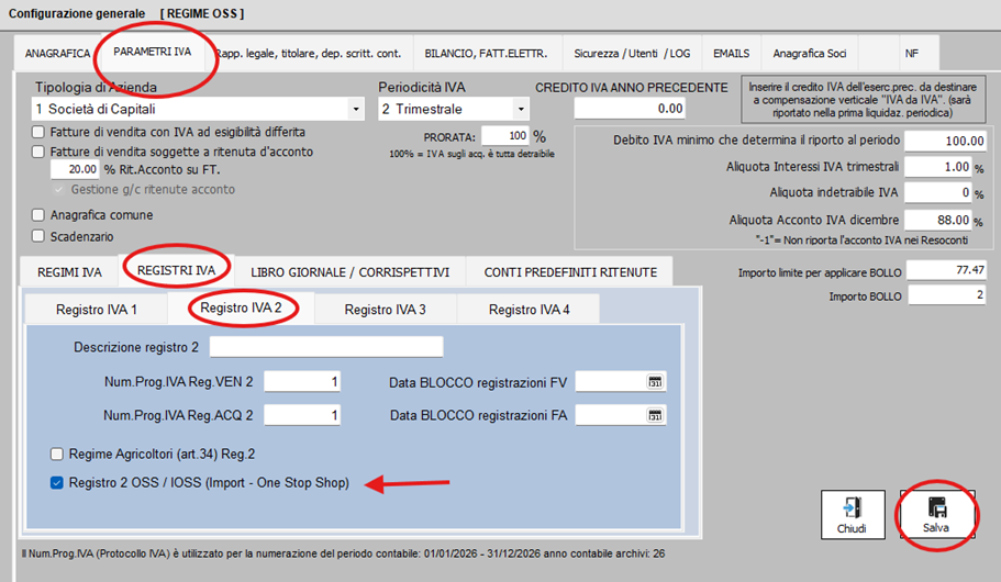 2. Dedicare uin Registro Iva vendite (es: Registro IVA 2) al regime OSS/IOSS --> attivare opzione come in figura