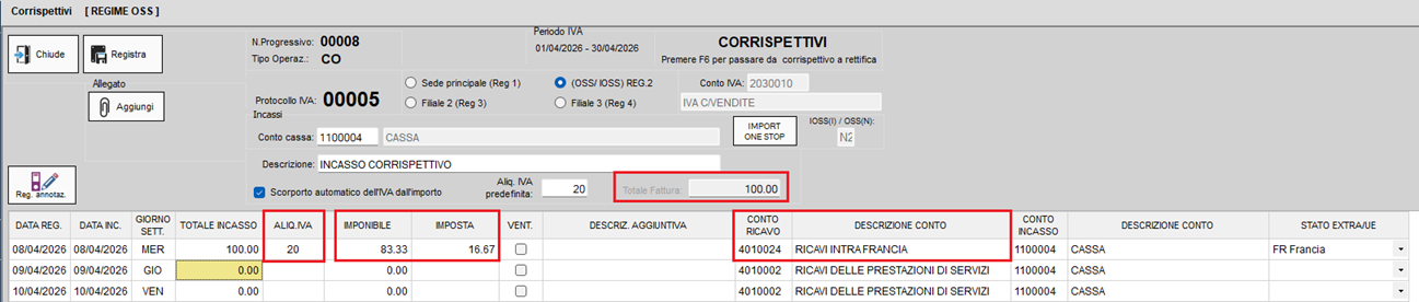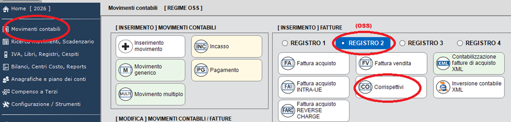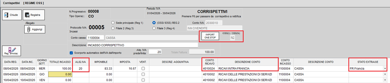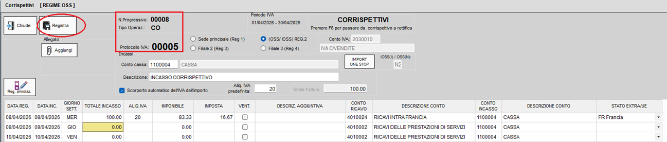 - Il campo "N" indica l' “Operazione in regime OSS” (in figura N2 perchè nel caso si registra OSS su registro n. 2)
