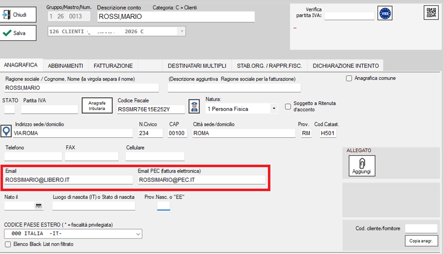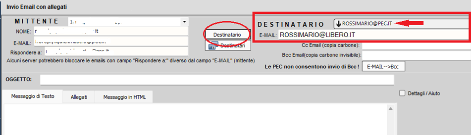 Se nell’anagrafica del cliente sono presenti sia l’indirizzo email ordinario sia l’indirizzo di Posta Elettronica Certificata (PEC), in fase di invio del messaggio dalla funzione “Emails” è possibile selezionare quale indirizzo utilizzare per l’invio.